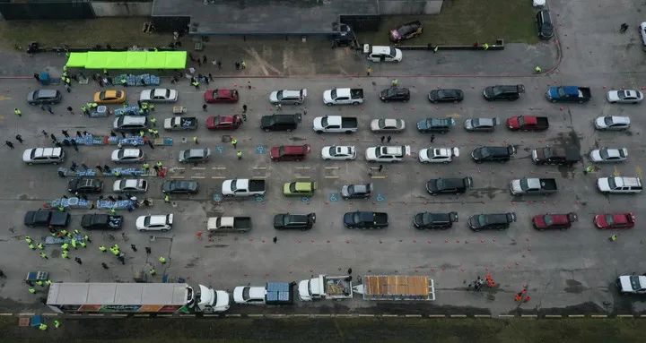 2月21日,美国得克萨斯州休斯敦的居民开车排队领取饮用水。新华社/路透