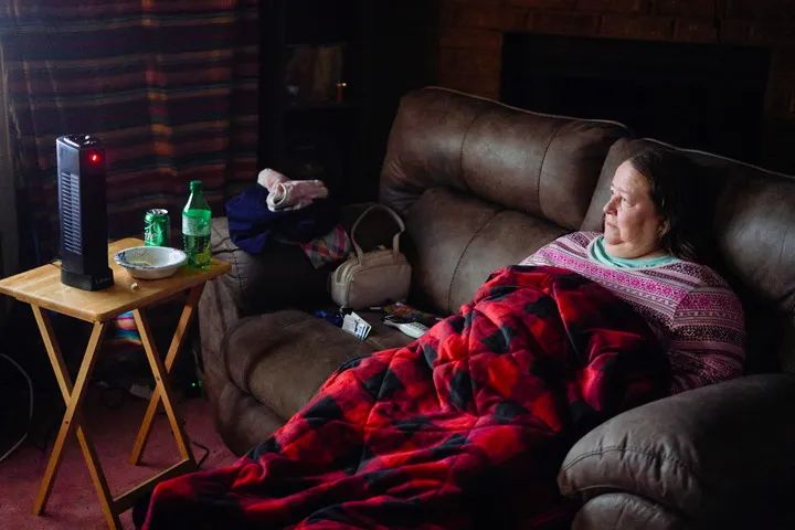 2月20日,美国得克萨斯州沃思堡,一名女子在断电的家中盖被取暖。新华社/路透