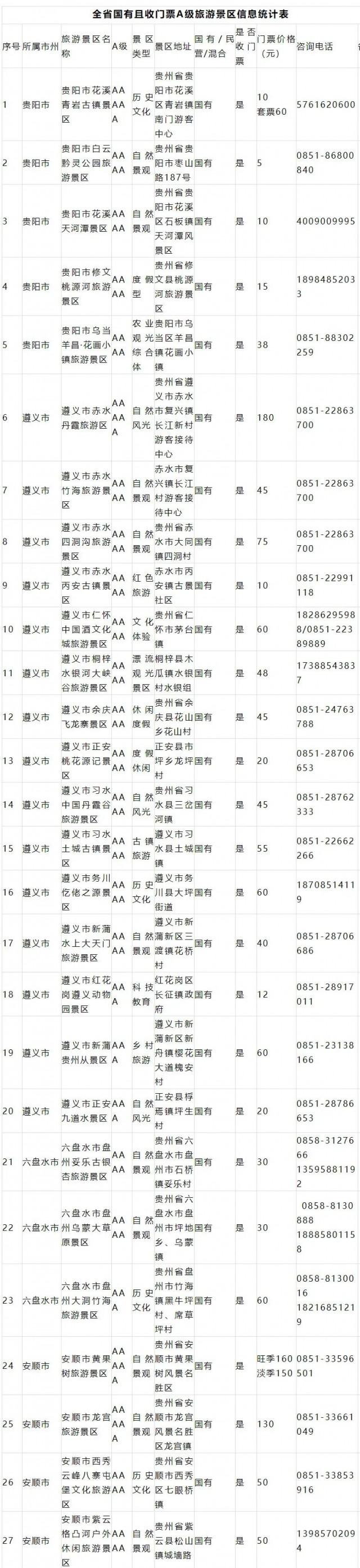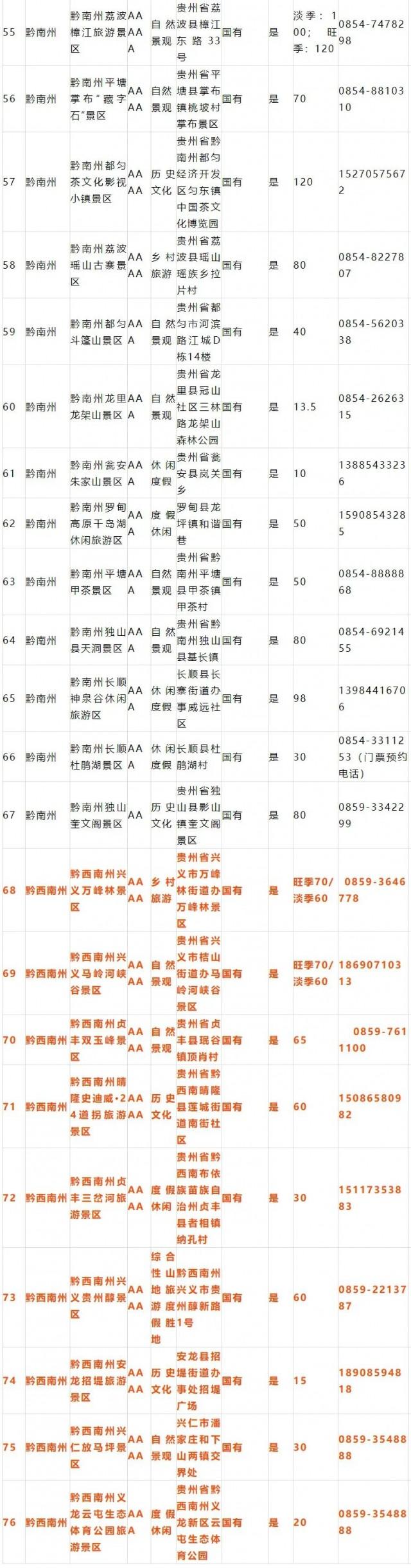 贵州76家免门票的国有a级景区全名单