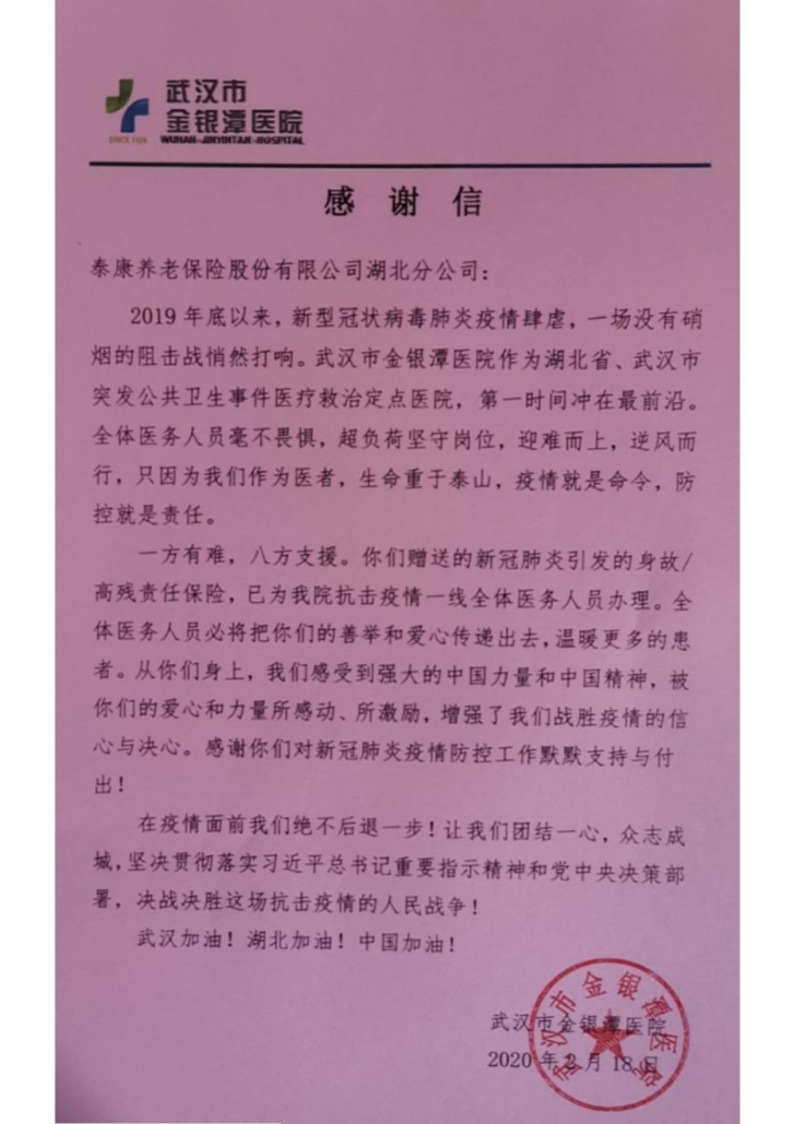 泰康收到的武汉金银潭病院谢谢信