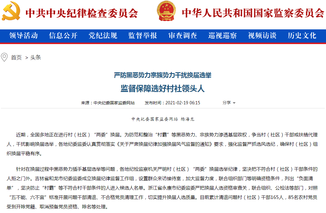 针对在换届过程中黑恶势力插手基层选举等问题,各地纪检监察机关严明村(社区)“两委”换届选举纪律,坚决把不符合村(社区)干部条件的人拒之门外。吉林省和龙市纪委监委成立换届纪律监督工作组,设置群众来访接待室,加大监督力度,联合组织部门等明确资格条件,列出“负面清单”,坚决防止“村霸”等不符合村干部条件的人进入候选人名单。浙江省永康市纪委监委严把换届人选资格审查关,联合组织、公检法等部门,对照“五不能、六不宜”标准开展问题干部清退、不合格党员清理工作,切实提升换届人选质量。目前累计清退问题村(社区)干部165人,85名农村党员受到开除党籍、取消预备党员资格、除名等处理。