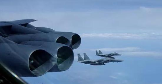 与美军两架b-52计谋轰炸机在东海及日本海上空进行了联合练习训练。