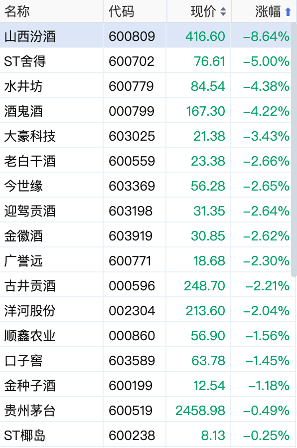 ST舍得、水井坊、酒鬼酒等多股半日跌幅超过4%,贵州茅台盘中一度跌逾3%,不过随后跌幅收窄至0.5%左右。