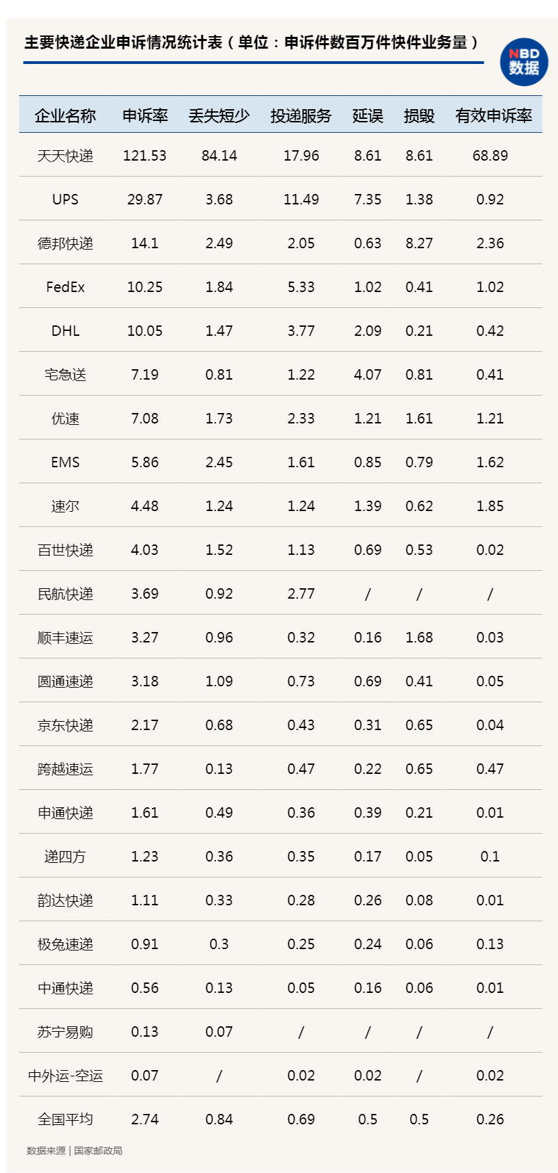 通晓系快递公司申述率在三月呈现必然回落。
