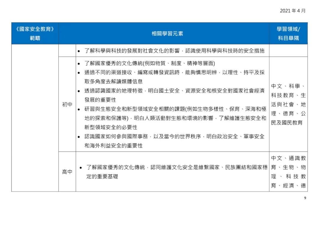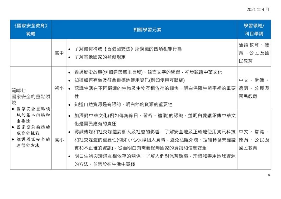 公布8其中小学科目新增添入国家安然教导内容连同今年2月初公布的3个科目的国安教导课程框架