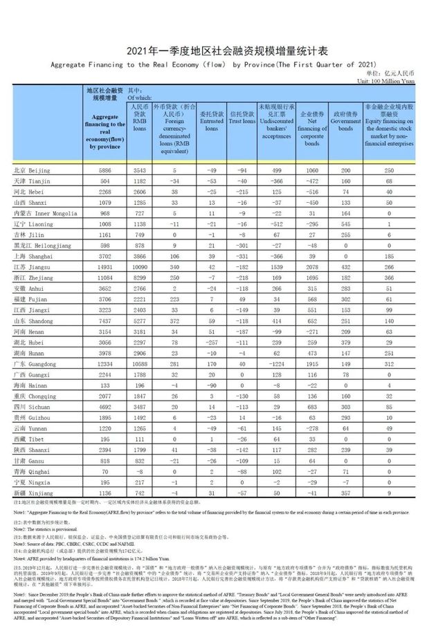 央行网站5月6日公布2021年一季度地区社会融资规模增量统计表显示。