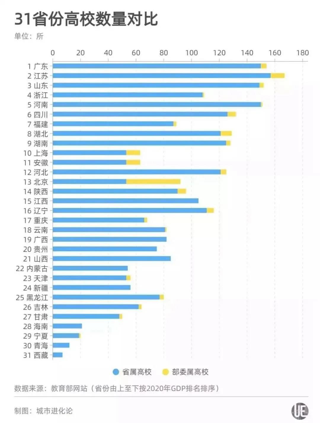 解读:福建本科院校数排在全国第17位、东部9省市第8位;国家级“双一流”高校仅2所。