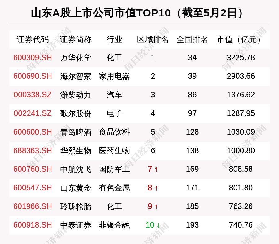 山东板块市值top10排名。