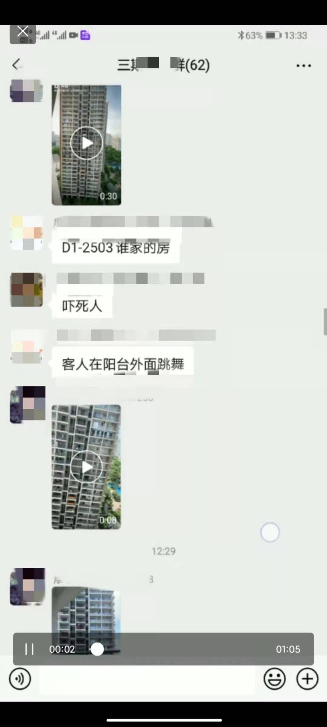 微信群内有人称客人在阳台外舞蹈视频截图