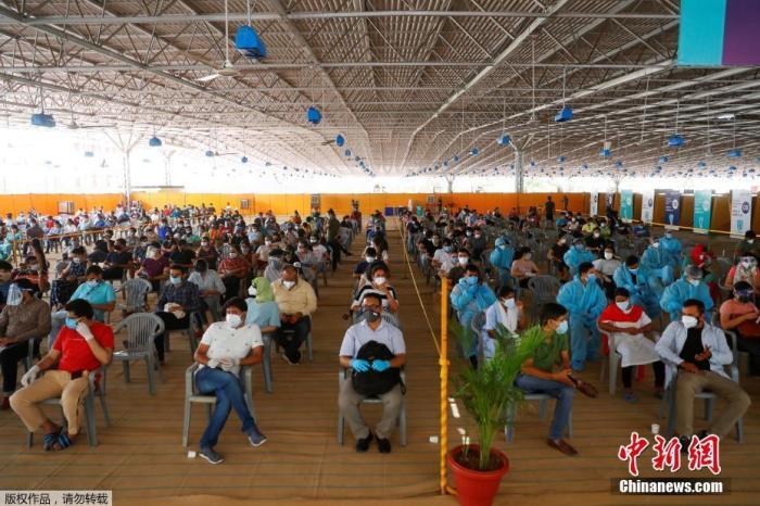 人们带着防护口罩在疫苗接种中间等待接种印度自产的covishield新冠疫苗。