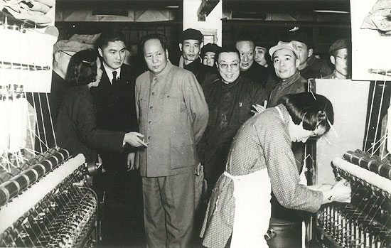 1956年1月10日,中共中央主席毛泽东在柯庆施和荣毅仁等陪同下,视察上海公私合营申新棉纺九厂。上海纺织博物馆供图