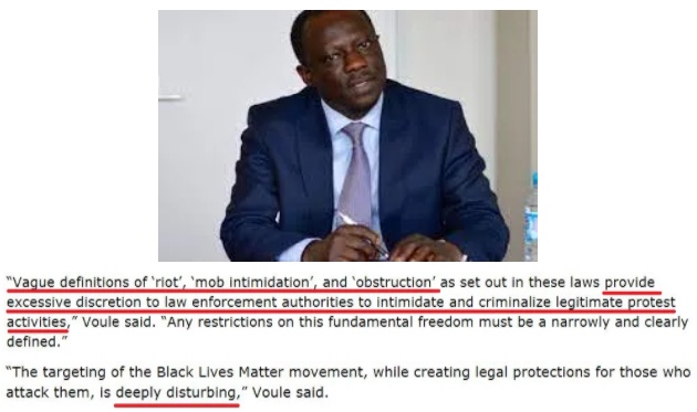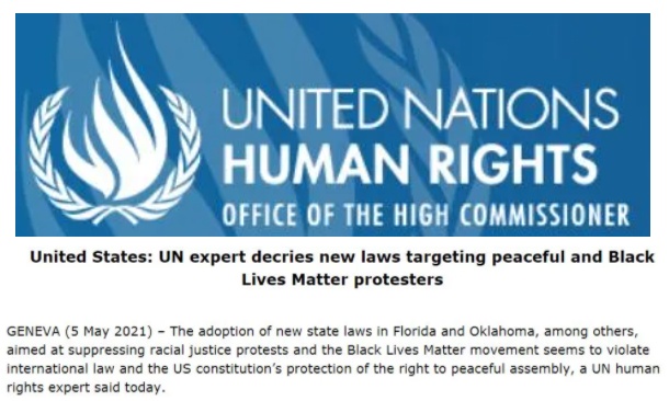 非难美国佛罗里达州和俄克拉何马州等地经由过程的旨在压制反种族轻蔑抗议活动的新司法违反国际法和美国宪法对和平聚会会议权的保护条目。