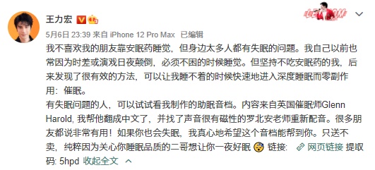 王力宏在社交媒体分享自己的助眠音档。他发文表示“只送不卖。