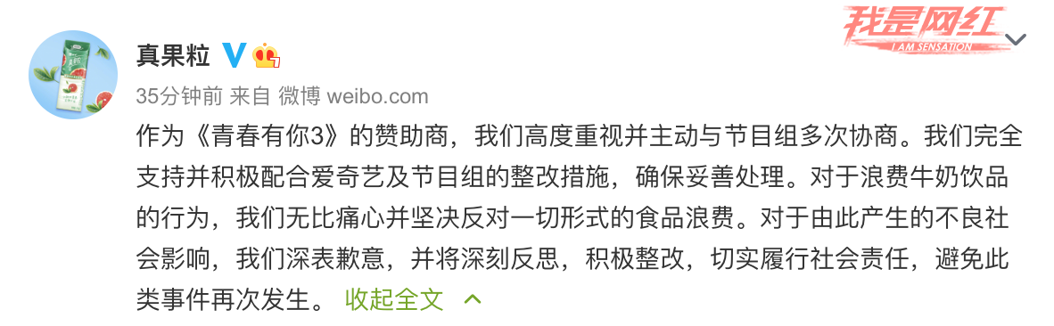 蒙牛真果粒5月7日经由过程官方微博道歉:作为《青春有你3》的辅助商。