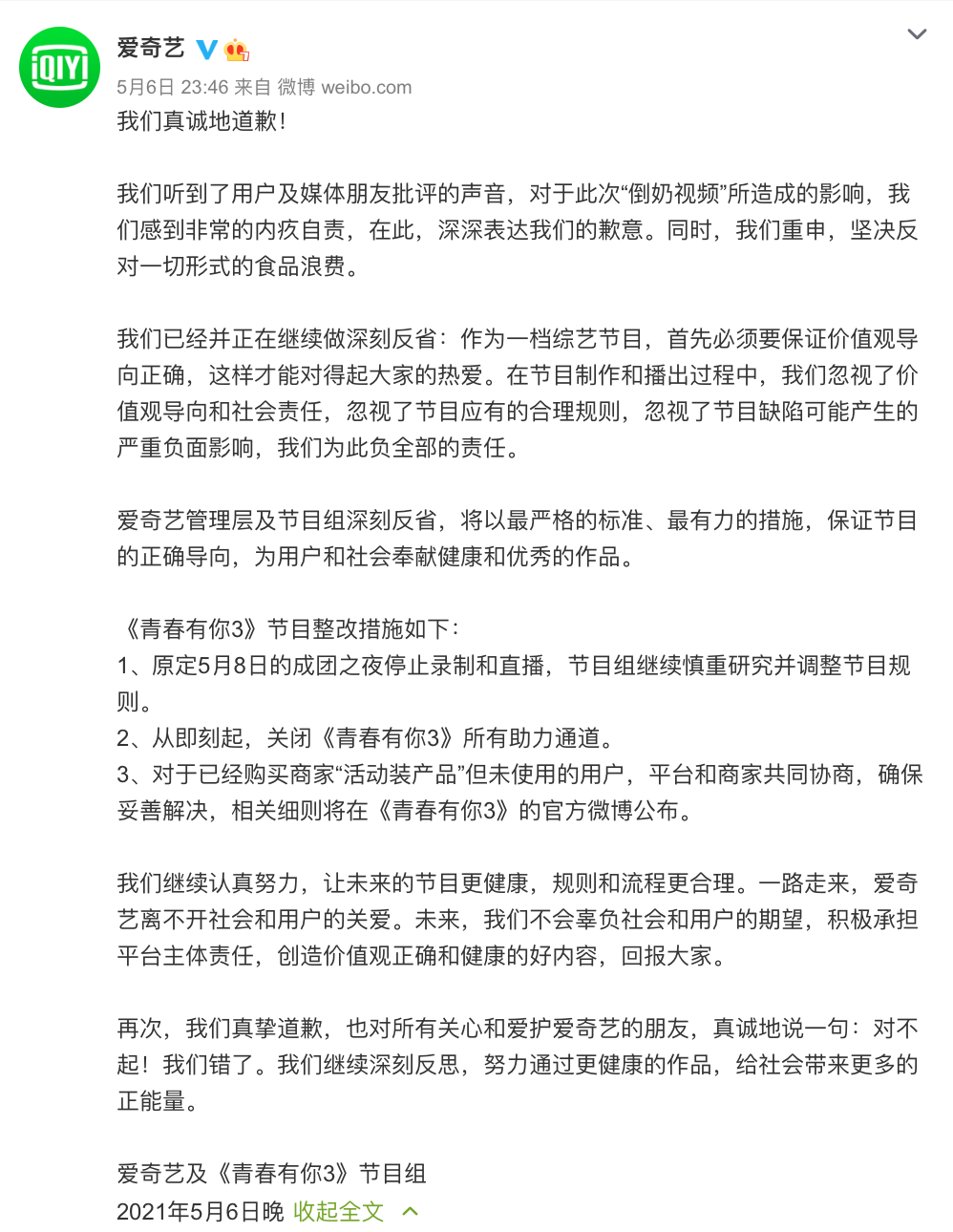 爱奇艺官方微博就“倒奶视频”一事颁发道歉文章。