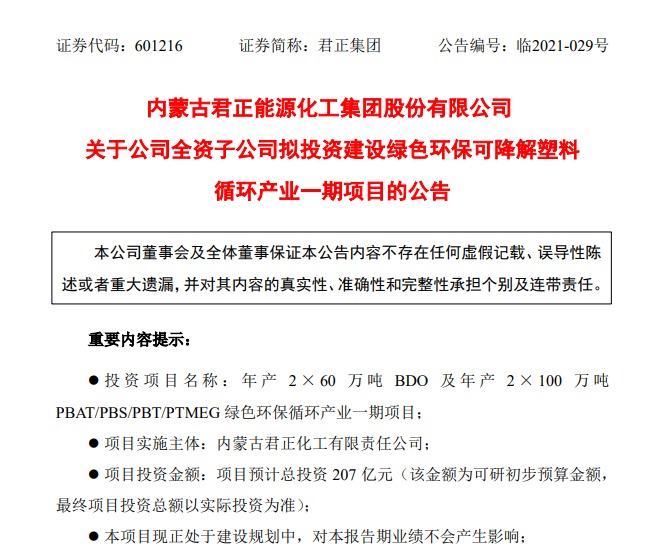 扶植年产2×60万吨bdo及年产2×100万吨pbat/pbs/pbt/ptmeg绿色环保轮回财产一期项目。项目估计总投资207亿元。