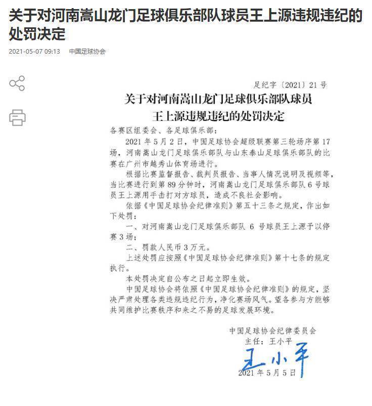 银河信誉平台wx17 com:足协罚单:王上源因掌掴郭田雨停赛3场罚款3万元