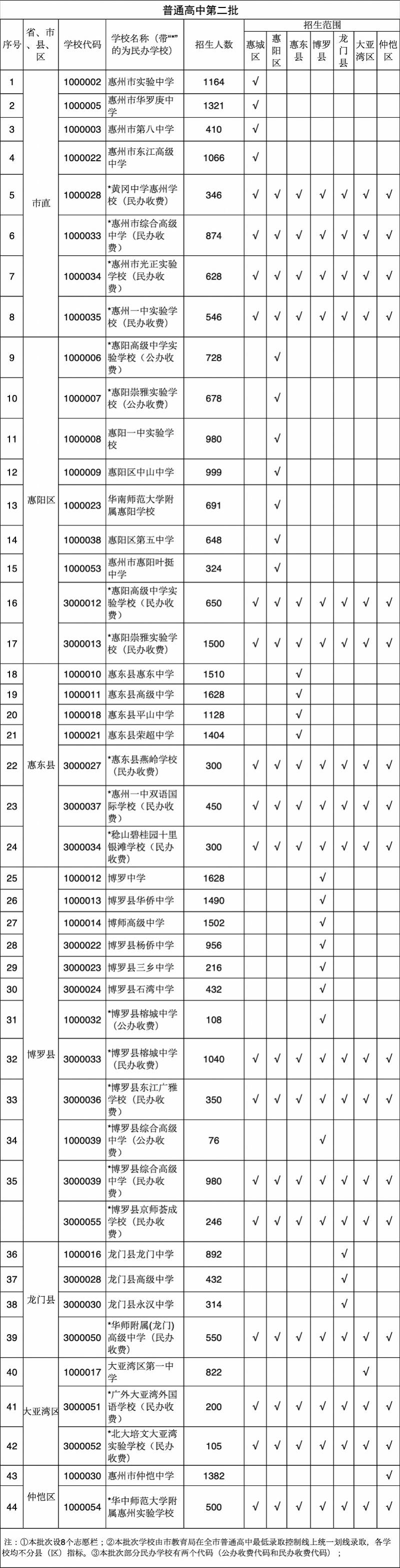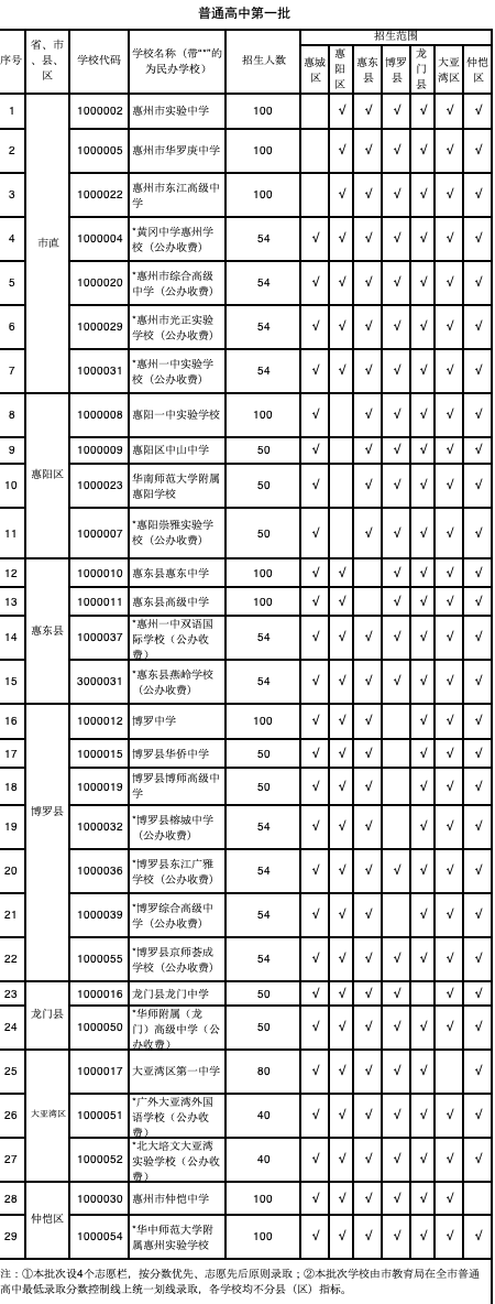分手是:惠阳一中实验黉舍(100人);惠阳中山中学(50人);华南师范大年夜学隶属惠阳黉舍(50人);惠东中学(100人);惠东县高档中学(100人);博罗中学(100人);博罗县华侨中学(50人);博师高档中学(50人)龙门中学(50人);大年夜亚湾第一中学(80人)