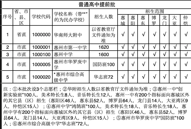 今年还新增了两所可填报黉舍:惠州市华罗庚中学国防班(招100人)、惠州市综合高档中学华志班(招72人)