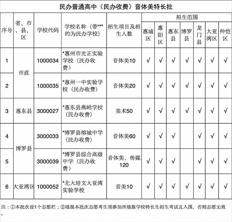今年惠州通俗高中黉舍共设六个自愿批次:通俗高中体育、艺术项目专项批(1个自愿栏)、通俗高中提前批(3个自愿栏)、公办通俗高中(含夷易近办公费生)音体美数特长批(1个自愿栏)、通俗高中第一批(4个自愿栏)、通俗高中第二批(8个自愿栏)、夷易近办通俗高中(夷易近办收费)音体美特长批(1个自愿栏)