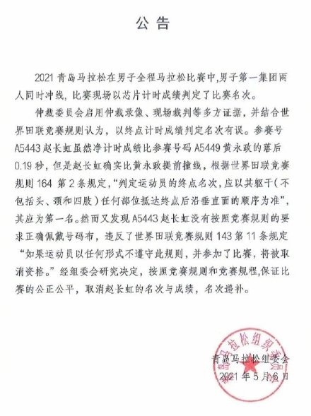 组委会发明赵长虹没有按照角逐规则的要求精确佩戴号码布。