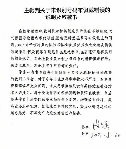 主裁判也公布了关于未识别号码布佩戴差错的阐明及道歉书。