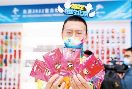手捧金元宝、怀抱玉如意、拎着大灯笼、身坐红锦鲤……这些形态各异的冰墩墩徽章来到北京2022官方特许商品旗舰店了!在刚刚过去的春节假期里,多款以新年为主题的北京冬奥会特许商品新品上市,带着美好春节祝愿的冰墩墩拜大年系列徽章就是其中的一种。位于王府井工美大厦一层的北京2022官方特许商品旗舰店里,年味和冬奥撞了个满怀,吸引不少市民前来选购。 本报记者 阎彤摄