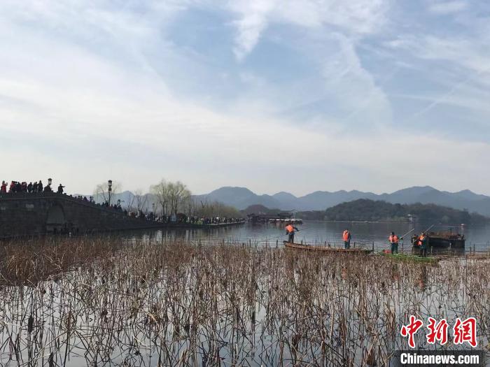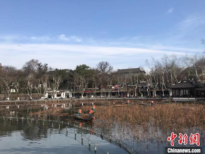 中新网杭州2月22日电 2月22日,浙江杭州西湖景区的北里湖断桥荷区上,停着9条小船。船上的工人挥舞着手中的长镰刀,镰刀所到之处,残荷应声而倒。当日,西湖残荷的收割工作正式启动。