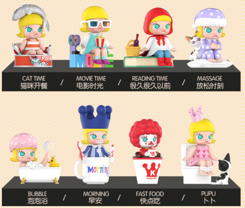 此前,molly基础上整个是站姿,当站姿成长到必然阶段的时刻,肖冰团队就跟设计师沟通说,整个是站姿,假如去表现生活的历程,就会有一点艰苦,是不是可以做一个姿态的延伸,于是就有了“molly的一天”的系列。