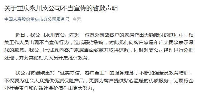 中国人寿保险株式会社重庆市分公司经由过程微信"民众,"号宣布道歉声明。