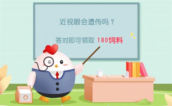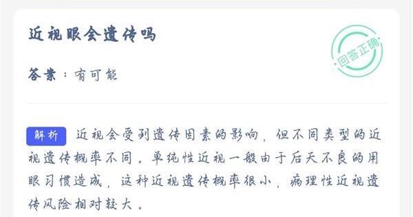 担忧近视眼会不会遗传给下一代。本日蚂蚁庄园便是问大年夜家近视眼会遗传吗?一路来看看谜底吧。