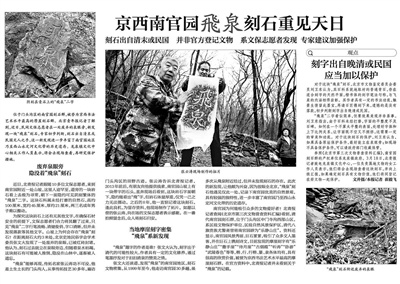 北京青年报刊发题为《京西南官园“飛泉”刻石重见天日》的报道后。
