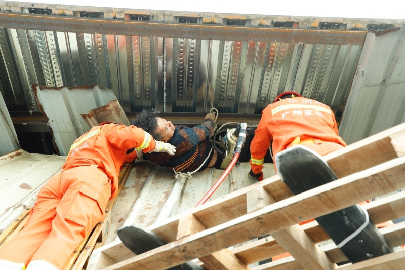 增援力量迅速到场,消防员们利用支撑套具对救援部位进行顶撑保护,利用液压扩张器对彩钢板下两边的钢结构同时顶撑,将被困人员的位置撑大,便于实施救援;又利用厂区的叉车搭建救援平台,成功的将腿部被夹住的被困群众从房檐夹缝中救出。