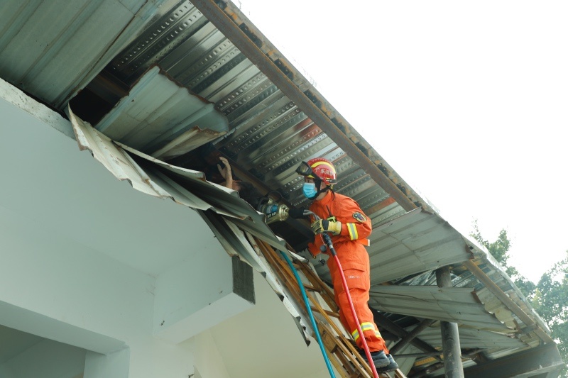 另一边,消防员在确认楼板下的人员准确位置后,开始实施救援。他们在其周围利用凿岩机、无齿锯等工具,对房顶进行破拆,成功的破拆出一个救生的通道。之后,被困群众自己从逃生通道缓缓移动出来。
