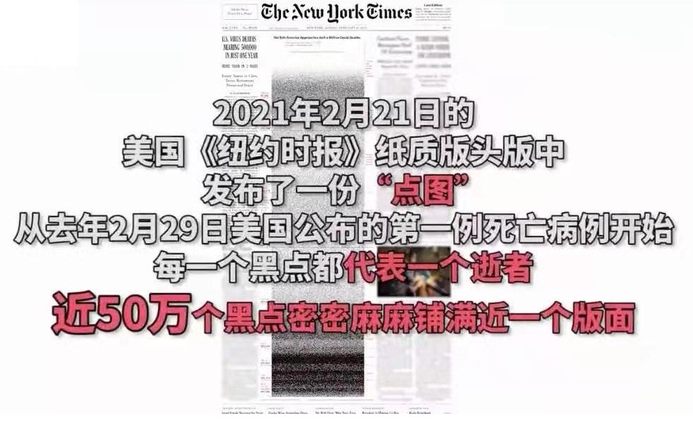 当地时间2月21日,《纽约时报》纸质版头版中发布了一份“点图”:从去年2月29日发现的第一例死亡病例开始,每一个黑点都代表一个逝者,近50万个黑点密密麻麻铺满近一个版面。