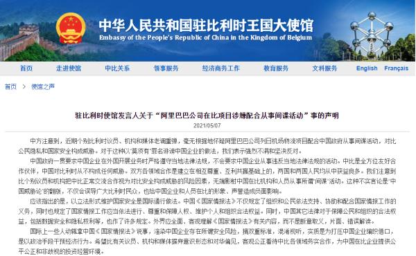 中国驻比利时使馆网站7日宣布《驻比利时使馆谈话人关于“阿里巴巴公司在比项目涉嫌共同从事特工活动”事的声明》