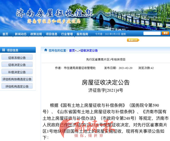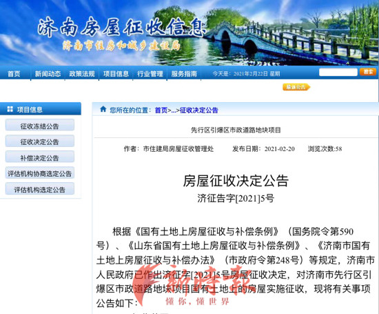 近日,济南市政府作出两项房屋征收决定,分别对先行区崔寨南片区1号地块项目、引爆区市政道路地块项目国有土地上的房屋实施征收。上述两项目征收补偿签约期限均为30天,自2021年3月1日起至2021年3月30日止。