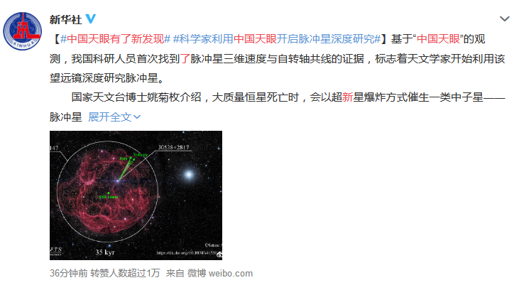 我国科研职员首次找到了脉冲星三维速率与自转轴共线的证据。
