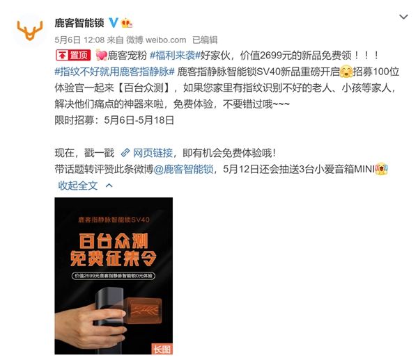 作为头部品牌,鹿客智能锁不停致力于去发掘用户的痛点需求,然后努力打造满意用户需求的产品,给用户最优质的产品和办事体验。在发明部分智能锁用户深受指纹识别体验差的困扰后,鹿客发挥了市场中的带头感化,推出指静脉智能门锁sv40,公然深受用户的迎接,产品还未正式上市,百台众测的消息一出就引起了火爆报名!
