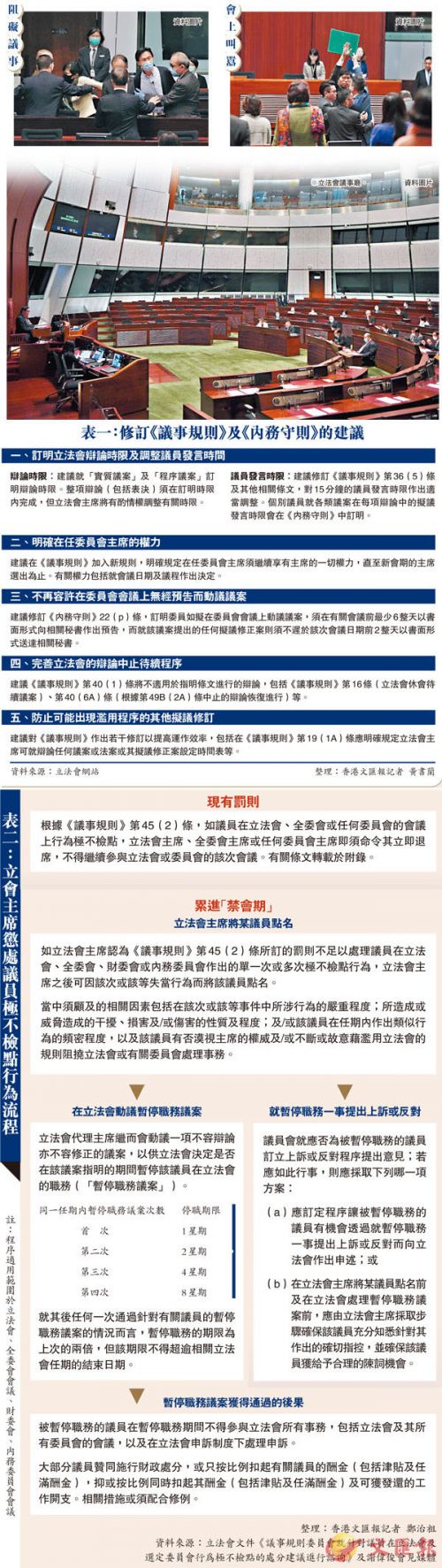星岛环球网消息:香港文汇报报道,立法会及委员会过往的拉布事件频发、部分立法会议员滥用程序企图揽炒立法会,社会各界一直要求检讨立法会规则及程序,惩罚在议会内搞事的议员。立法会议事规则委员会昨日举行闭门会议,讨论加强议员违规行为的罚则。议事规则委员会主席谢伟俊会后透露,委员会会议通过修订,加重对会议厅内行为不检的议员的罚则。有关修订建议将于本周五提交内务委员会上讨论,预计最快于下月24日提交大会处理。多名建制派立法会议员昨日接受香港文汇报访问时表示,过去揽炒派肆意捣乱议会秩序,令会议无法正常进行甚至瘫痪,希望今次堵塞漏洞后,有助保障议会未来运行顺利。