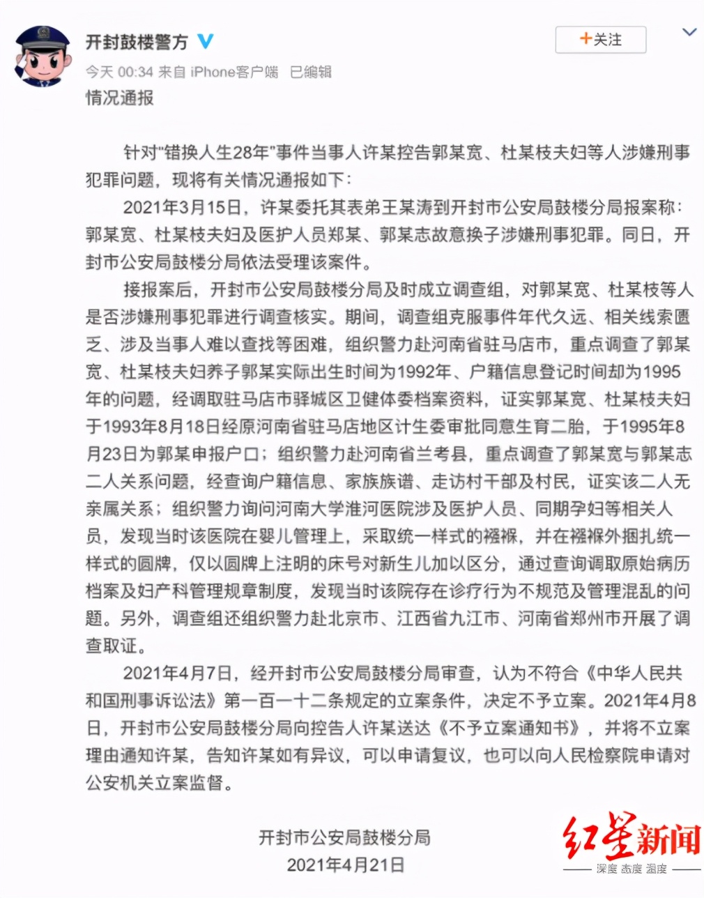 河南省开封市公安局鼓楼分局与涉事病院责任单位河南大年夜学均针对“错换人生28年”事故宣布环境传递