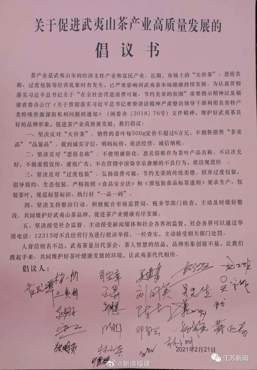 21日下午,武夷山市召开促进茶叶市场健康发展推进会,26家曾出现在网传“天价茶”榜单上的武夷山茶企负责人共同签署《关于促进武夷山茶产业高质量发展的倡议书》,坚决反对“天价茶”“恶俗名称”“过度包装”,承诺不做虚假宣传,规范经营管理,不销售“非卖品”“品鉴品”,自觉接受监督。