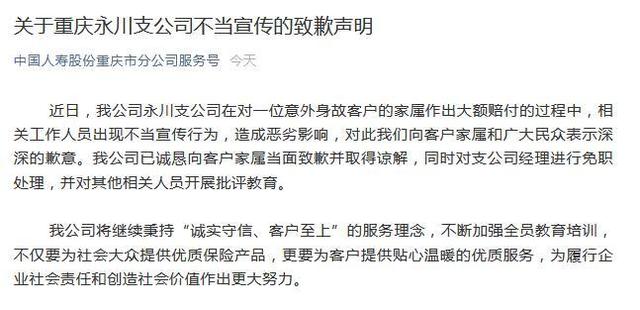 中国人寿保险株式会社重庆市分公司经由过程微信"民众,"号宣布道歉声明