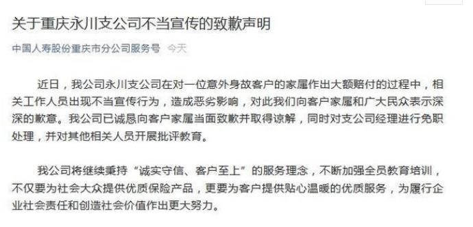 中国人寿保险株式会社重庆市分公司经由过程微信"民众,"号宣布道歉声明。