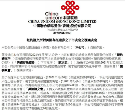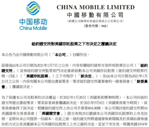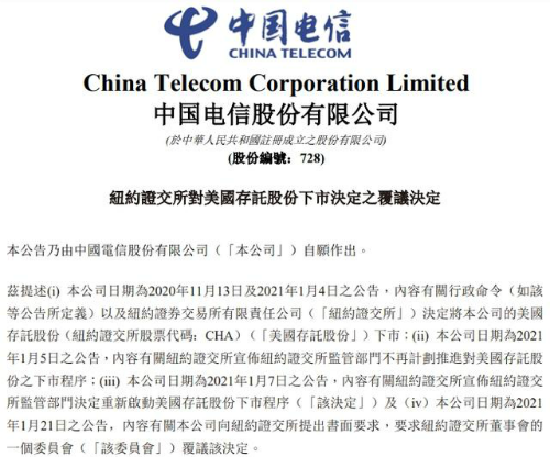 三大年夜运营商曾合营对美国纽交所的下市要求申请进行复议。