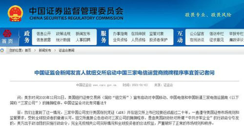 今年1月中国证监会新闻谈话人就纽交所启动中国三家电信运营商摘牌法度榜样事件答记者问时表示。