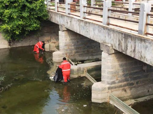 急速安排保洁职员对漂浮在河面上的杂物进行打捞。