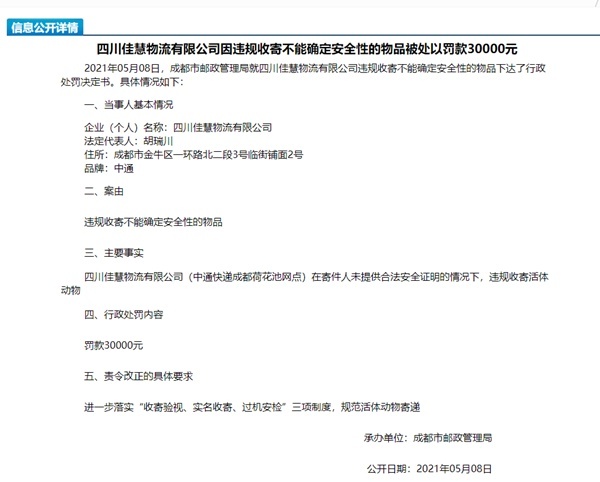 5月8日晚 四川新闻网记者从成都会邮政治理局官网获悉 违规收寄活体动物 被处以罚款30000元;成都中竞物流有限公司(中通快递四川省治理中间)在快件安然保障方面对四川佳慧物流有限公司(中通快递成都荷花池网点)未推行统一治理 被处以罚款50000元(图片滥觞于成都会邮政治理局官网)