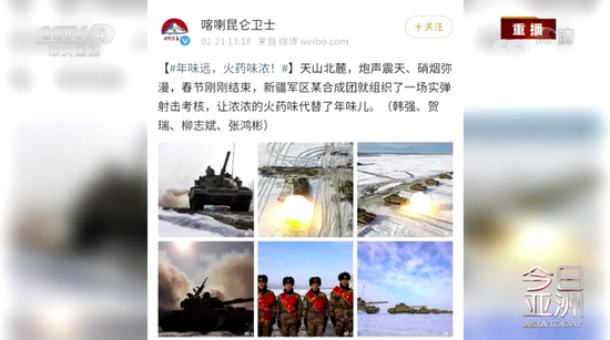 2月21日,中国人民解放军新疆军区官方微博发布一组演习图片,配文“天山北麓,炮声震天、硝烟弥漫,春节刚刚结束,新疆军区某合成团就组织了一场实弹射击考核,让浓浓的火药味代替了年味。”