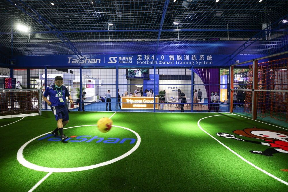 参展商在消博会现场演示足球智能练习系统。 新华社记者 张丽芸 摄